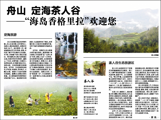 舟山市定海区地处杭州湾外缘,舟山本岛西侧,东邻普陀山、朱家尖、桃花岛旅游区。定海共有岛屿128个,是全国唯一的一座省级海岛历史文化名城。定海,有沉淀了数千年的海洋文化底蕴,有“海上河姆渡”马岙土墩文化遗址、同归域和舟山鸦片战争遗址公园;有保存完好的刘鸿生、董浩云、丁光训、台湾作家三毛等名人故居和祖居;有明清时期祖印寺、蓝府大院、古民居和清明古街等景点。近年来,乡村旅游别具特色,伊甸园、钓浪湾、甬东鱼庄、天鹅山庄等,都吸引了众多的游客休闲度假。随着舟山跨海大桥的贯通,舟山群岛新区和海洋综合试验区落户舟山,给定海的休闲旅游、生态旅游带来了契机,双桥镇的茶人谷景区的挖掘和打造,有利于提升定海旅游的形象和品质。