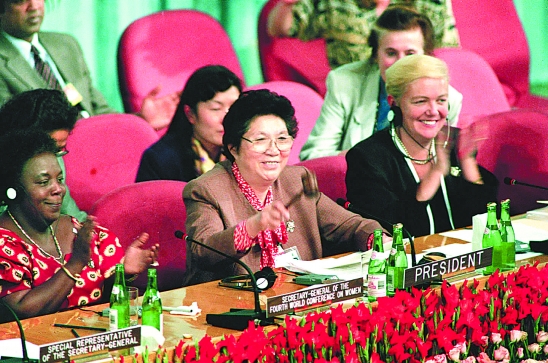 资料照片:1995年9月15日,陈慕华在北京举行的联合国第四次世界妇女大会上宣布通过《北京宣言》。新华社发