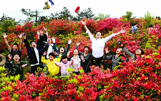 万亩杜鹃竞相绽放,吸引了数千来自上海、杭州、金华等地游客登山观赏。记者 梁臻 报道组 林庆雄 潘俊 摄