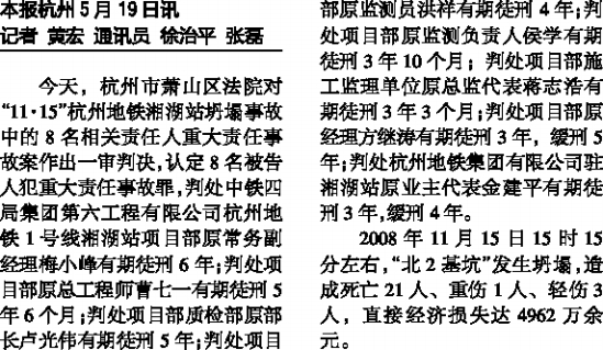 今天,杭州市萧山区法院对“11·15”杭州地铁湘湖站坍塌事故中的8名相关责任人重大责任事故案作出一审判决,认定8名被告人犯重大责任事故罪,判处中铁四局集团第六工程有限公司杭州地铁1号线湘湖站项目部原常务副经理梅小峰有期徒刑6年;判处项目部原总工程师曹七一有期徒刑5年6个月;判处项目部质检部原部长卢光伟有期徒刑5年;判处项目部原监测员洪祥有期徒刑4年;判处项目部原监测负责人侯学有期徒刑3年10个月;判处项目部施工监理单位原总监代表蒋志浩有期徒刑3年3个月;判处项目部原经理方继涛有期徒刑3年,缓刑5年;判处杭州地铁集团有限公司驻湘湖站原业主代表金建平有期徒刑3年,缓刑4年。