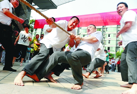 5月20日,杭州拱墅区首届社区休闲运动会开幕,2000多名医生、厨师、保洁员和社区居民,参加了排舞、花样拔河、体能比武、健康对抗等10个大类的比赛。图为参加拔河比赛的花中城酒店厨师。记者 梁臻 通讯员 陆洁 李翔 摄