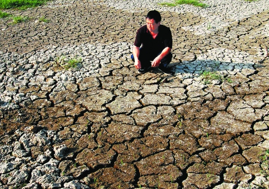| 江西遭遇历史罕见旱情 原本处于春夏多雨季节的江西,却遭遇历史罕见旱情。目前,江西省有57个县(市、区)出现轻度以上干旱,其中19个县(市、区)出现重度干旱,14个县(市、区)出现特旱。全省已栽早稻受旱面积达533万亩,140多万亩中稻无水泡田翻耕。图为5月20日,在江西省九江县城子镇,种粮大户农民张国周面对因干旱无法栽种的稻田,欲哭无泪。新华社发 |