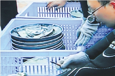 5月22日下午,考古人员整理从海底“南澳1号”明代古沉船发掘出水的瓷器(视频截图)。当日,考古人员在中国广东汕头市南澳岛附近海域对“南澳1号”明代古沉船进行水下考古发掘,在沉船内发现大量瓷器,并打捞出水。 新华社发