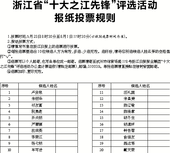 ③选票可以个人邮寄,也可由单位统一邮寄。选票请寄至杭州市体育场路178号浙江日报报业集团“十大之江先锋”评选活动办公室计票组收(请贴足邮票),邮编:310039。单张选票请直接贴在信封背面邮寄。