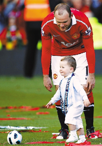 5月22日,曼联队队员鲁尼赛后与儿子卡伊在球场内庆祝联赛夺冠。
