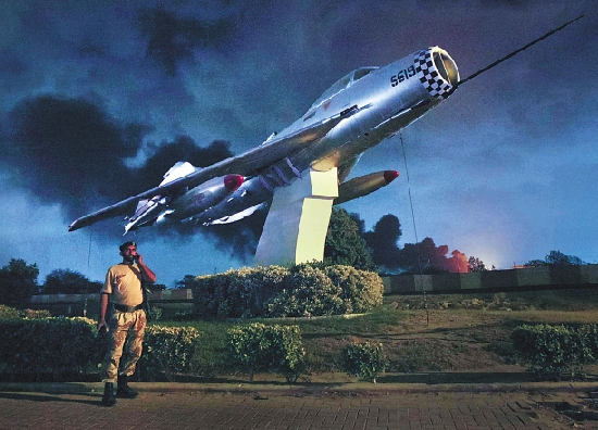 5月22日,在巴基斯坦南部港口城市卡拉奇,一名军官在遭袭的迈赫兰海军航空兵基地入口打电话。 新华社发