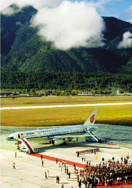资料照片:2006年9月1日,一架波音757客机在成都起飞,经过1100公里飞行,平稳降落在林芝机场,这标志着西藏第三个民用机场林芝机场成功实现首航。 新华社发