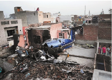 | 这是5月26日在距离印度首都新德里大约30公里处的法里达巴德一处民宅楼顶拍摄的飞机坠毁现场。印度一架小型民用飞机25日晚坠落在新德里人口稠密郊区的两栋民宅上,并引发大火,机上5名乘客和2名飞行员全部遇难,还造成地面至少3人死亡,1人受伤。 新华社发 |