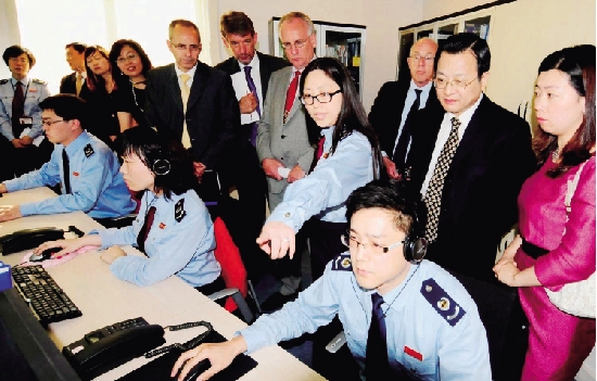 | 5月18、19日,荷兰税务与海关管理局局长彼得·维尔德一行先后对杭州财税12366服务中心和杭州市江干区国家税务局办税服务厅进行了考察。在听取杭州国税纳税服务基本情况和杭州财税12366服务中心工作介绍后,两国同行们进行了热烈的互动交流。图为荷兰客人们参观杭州财税12366服务中心。 里尔 文/摄 |
