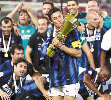 国际米兰队队长萨内蒂(前)在获胜后亲吻奖杯。 新华社发