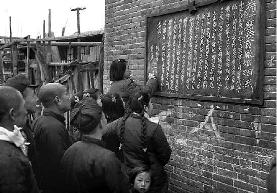 20世纪50年代初,北京市的基层干部在街头书写宣传婚姻法的板报。 新华社发(资料照片)