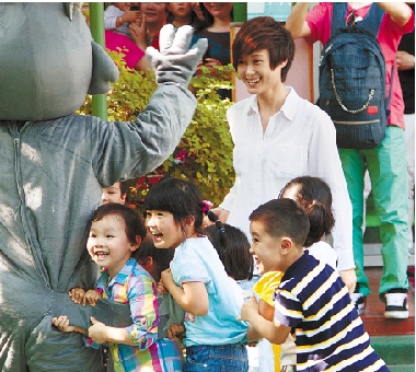 5月30日,著名歌手李宇春和朱丹悄悄来到位于杭州四季青商教苑社区的浙江省听力语言康复中心,和听障小朋友们一起玩起了老鹰抓小鸡的游戏,祝福听障小朋友们六一快乐。 汪开敏 摄