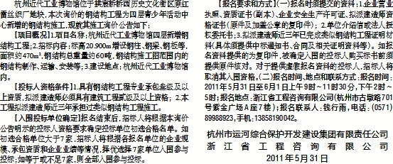 【报名要求和方式】(一)报名时须提交的资料:1.企业营业执照、资质证书(副本)、企业安全生产许可证、拟派建造师资格证书(原件及加盖公章的复印件); 2.单位介绍信或法人授权委托书;3.拟派建造师近三年已完成类似钢结构工程证明材料(具体须提供中标通知书、合同及相关证明资料等)。如报名资料提供的为复印件,被确定入围的投标人购买标书前须提供原件核对。对于提供虚假报名资料的投标人,招标人将取消其入围资格。(二)报名时间、地点和联系方式:报名时间:2011年5月31日至6月1日上午9时~11时30分,下午2时~5时;报名地点:浙江省工程咨询有限公司(杭州市古墩路701号紫金广场A座7楼);报名联系人:钱行雨,电话:(0571)89988923,手机:13858190042。