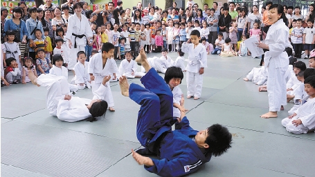 6月1日儿童节,浙大玉泉幼儿园中六班的柔道表演吸引了许多家长的关注。这个班上有位家长是奥运柔道冠军冼冬妹的队友,她利用业余时间义务训练全班小朋友,因此柔道成为该班的特色健身项目。 记者 潘海松 摄