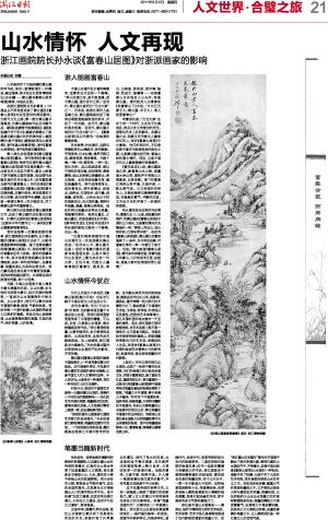 “浙派的画风也就是浙江画院艺术家们的总体画风。”孙永说画家们都很清楚,笔墨要应随时代而变。一个流派要生存和发展,靠的就是在继承之中要不断有所创新。自明朝以来所开创的浙派绘画,就是在近代任氏三杰、吴昌硕、黄宾虹、潘天寿等一批大师们的不懈努力之下,融会贯通了中国画的艺术性、文学性、哲学性、科学性以及民族性,把浙派艺术浑厚博大、超凡风雅的画风特点推向一个至高的境界。因此,浙江画家们面对新潮迭起,在艺术态度上既不是一概排斥,也不是盲目趋从。而是在执守浙派传统的基础上,积极调整和更新自己的艺术观、审美观和人生观,在吸收《富春山居图》为代表的绘画艺术营养之中创新传统,发展传统,画出浙派笔墨的时代新貌。