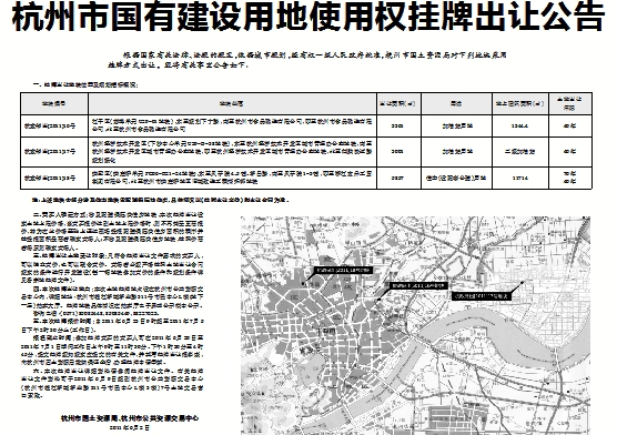 六、本次挂牌出让详细资料请参阅挂牌出让文件。有关挂牌出让文件资料可于2011年6月9日起到杭州市公共资源交易中心(杭州市钱江新城新业路311号市民中心L楼3楼)7号土地交易窗口索取。