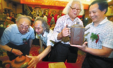 | 日前,西泠印社书画名家与江苏宜兴的制壶大师们会聚杭州,庆祝大型电视纪录片《丹青紫砂宜于兴》开机。艺术家们将联合制作百把紫砂名壶,以纪念辛亥革命100周年。 本报记者 林云龙 摄 |