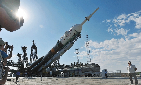 | “联盟”飞船整装待发 国际空间站新长期考察组成员俄罗斯宇航员谢尔盖·沃尔科夫、美国宇航员迈克·福苏姆和日本宇航员古川聪将于6月7日乘坐“联盟TMA-02M”载人飞船奔赴空间站,开始为期半年的太空之旅。图为6月5日,在哈萨克斯坦境内的拜科努尔发射场,“联盟TMA-02M”载人飞船在发射台进行安装。 新华社发 |