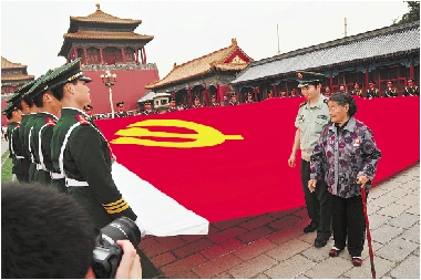 | 90平方米党旗亮相北京 6月6日,“沂蒙六姐妹”代表尹淑英(前右)在天安门警卫支队政委王建华上校陪同下观看展开的巨幅党旗。 当日,一面90平方米的巨幅党旗在北京午门广场进行展示,并由天安门国旗护卫队收藏。这面党旗是“沂蒙六姐妹”代表尹淑英、山东拥军模范红嫂朱呈镕、全国拥军模范贾美荣等亲手绣制的,作为向中国共产党建党90周年献礼送到北京,表达她们对党的满腔热爱与忠诚。 新华社记者 杨光 摄 |