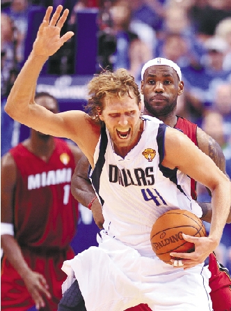 小牛队球员诺维茨基与热火队球员詹姆斯拼抢。 新华社发