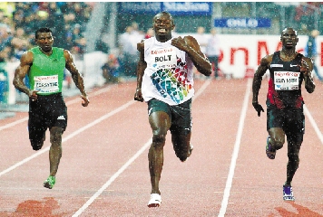 6月9日,牙买加选手博尔特(中)在男子200米比赛中。当日,博尔特在奥斯陆举行的2011国际田联钻石联赛奥斯陆站男子200米比赛中,以19秒86的成绩获得冠军。 新华社发