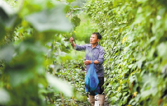 昨天,杭州乔司镇永西村村民趁雨停间隙,来到各自的承包地抢收已经成熟的丝瓜、四季豆、香葱等蔬菜,确保市场供应。图为村民范根龙在抢收田里的丝瓜。 本报记者 吴元峰 摄