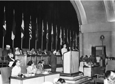 资料照片:1955年4月18日,周恩来总理在印度尼西亚的万隆市召开的首届亚非会议上发言。 新华社发