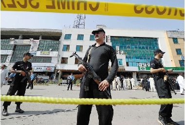 6月13日,在巴基斯坦首都伊斯兰堡,安全人员封锁爆炸现场。 新华社发