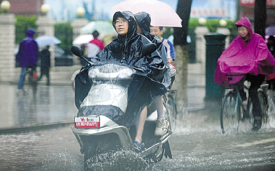 6月14日,湖北省武汉市,行人在积水的街道上骑车行驶。 新华社记者 郝同前 摄