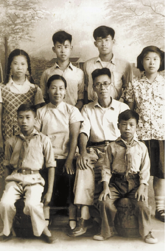 前排从左到右:胡教昂 胡教明;中间:胡孝心和妻子金云娣;后排从左到右:胡佩芬 胡教群 胡教平 胡佩玉 (资料图片) 1956年摄