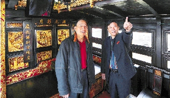 章水强(左)与南湖革命纪念馆陈列文保部负责人在红船内交谈。 新华社记者 韩传号 摄