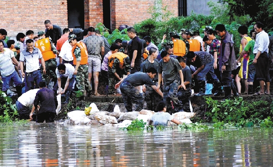 | 党员抢险冲在前 昨日,兰江水位超出危急水位2米多,兰溪云山街道吴村的兰江支流发生多起管涌,该村党员冲锋在前,带头抢险。 本报记者 梁臻 徐宪忠 摄 |
