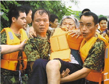 6月15日,在江西省乐平市接渡镇莲湖洲自然村,救援人员抬着被困的村民进行转移。