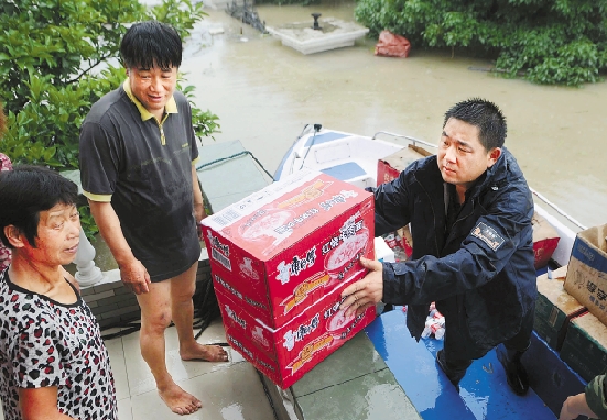 昨日,诸暨浦阳江沿岸多个村庄被淹,村民被困家中。许多村的党员组成突击队冲锋在一线,把水和食品送到居民家中,帮助群众渡过难关。 记者 胡元勇 诸暨日报记者 徐德文 摄