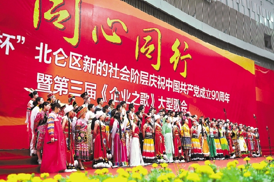 昨天,宁波北仑区举行庆祝建党90周年大型歌会,来自民营企业的近千名职工唱响《祖国颂》、《共产党好,共产党亲》等经典歌曲。 记者 吴晓鹏 通讯员 陈未鸣 杜文博 摄