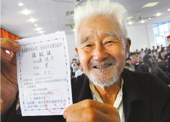 资料照片:2009年9月12日,安徽省六安市金安区人民新村社区举行居民委员会第三届换届选举大会。图为82岁的人民新村社区居民姜传义在展示自己的选民证。 新华社发