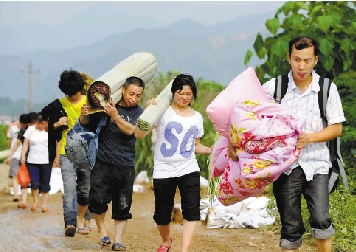 6月20日下午5点多,兰溪香溪镇兰江大坝上,来自新光电镀厂的几位工人带着棉被正在回厂区。一位工人说,19日晚上他们被转移到了安置点,现在洪峰过去了,水位下降了,他们也可以回到宿舍里了。 本报记者 梁臻 摄