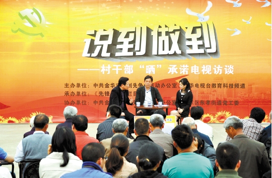 2011年4月21日,金华市委创先争优活动领导小组办公室在金东区东孝街道下于村举行“说到做到——村干部晒承诺访谈”活动,围绕“新一届村级班子的创业承诺是什么”、“2011年村级班子的任期承诺是什么”、“村党支部书记如何履职确保承诺事项实现”等问题进行。