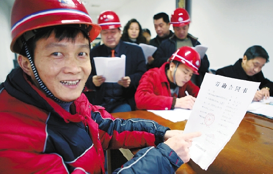 资料照片:2007年12月25日,农民工与用工单位签订劳动合同书。 新华社发