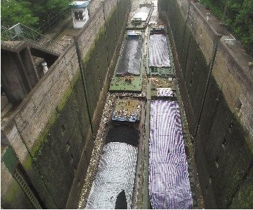 由于水流较急,船只停留在富春江水电站不能通行。 本报记者 林云龙 摄