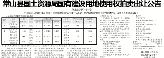 四、本次拍卖出让的详细资料和具体要求,见拍卖出让文件。申请人可于2011年6月25日至2011年7月15日到常山县国土资源局(二楼土地利用科)和县招投标中心获取出让文件。