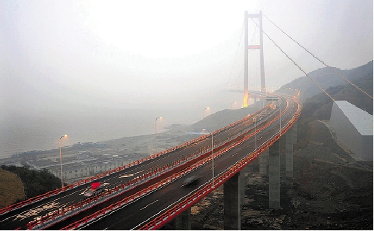 | 2010年12月25日,浙江舟山跨海大桥举行通车仪式。舟山大陆连岛工程以5座跨海大桥把舟山本岛与大陆连接,全程长约50公里,总投资超过130亿元人民币。大桥通车后,从杭州到达舟山定海城区只需要3个小时左右。 本报记者 黄曙林 钟昊 通讯员 姚峰 摄 |
