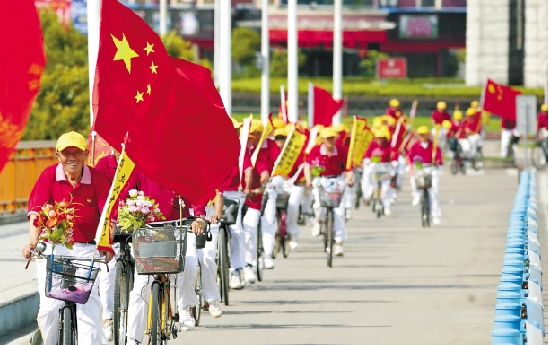 6月28日,东阳一支由近百名老年人组成的自行车队在街上骑行,庆祝中国共产党成立90周年。据介绍,其中年龄最大的84岁,最小的64岁。 孙振华 摄