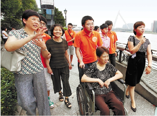 | 6月30日,在宁波老外滩,江北区党团员青年陪着残疾人一起欣赏甬城新变化。 胡建华 周松华 摄 |