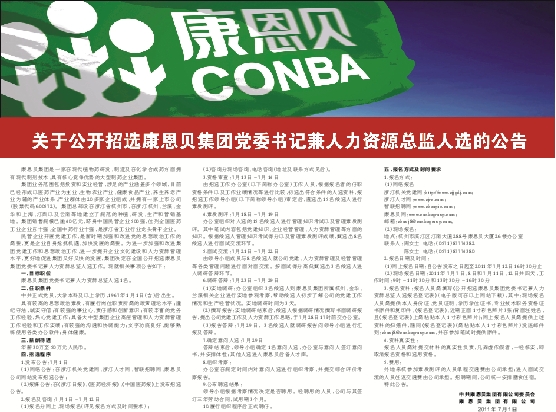 民营企业开展党建工作,是新时期加强和改进党的思想政治工作的需要,更是企业自身抢抓机遇、加快发展的需要。为进一步加强和改进集团党建工作和思想政治工作,进一步提升企业文化建设和人力资源管理水平,更好地促进集团又好又快的发展,集团决定在全国公开招选康恩贝集团党委书记兼人力资源总监人选工作。现就相关事项公告如下: