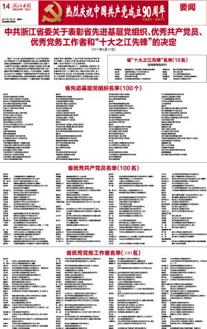 中共浙江省委关于表彰省先进基层党组织、优秀共产党员、优秀党务工作者和“十大之江先锋”的决定