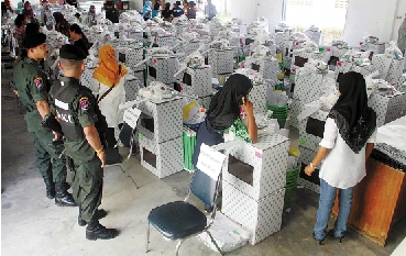 7月2日,在泰国南部也拉府,两名警察在大选用的投票箱旁警戒。 新华社发