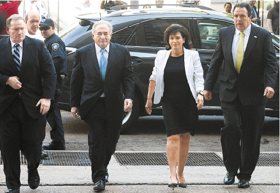 7月1日,在美国纽约曼哈顿,国际货币基金组织前总裁斯特劳斯-卡恩(左二)和妻子抵达纽约州高等法院。 新华社记者 申宏 摄