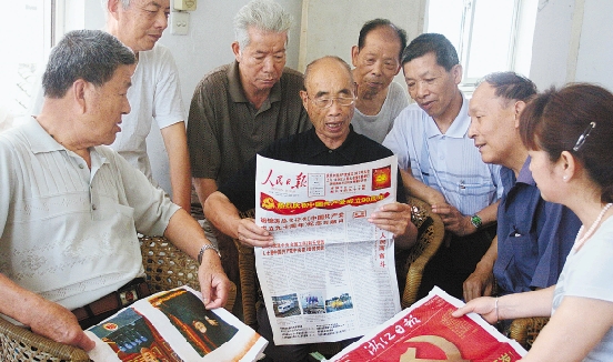 7月2日,温岭市箬横镇老年协会阅览室里,退休老人们正在认真学习胡锦涛总书记在庆祝建党90周年大会上的重要讲话。 梁学忠 摄