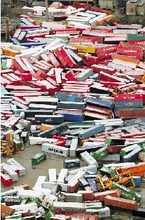 在日本仙台,遭海啸冲击的集装箱堆积在一起。 新华社发